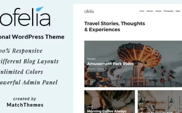 WordPress 主题 11月25日 编辑 前往下载 chen, yuting 取消关注 关注 私信 Ofelia 是一个旅行博客 WordPress 主题,用于撰写和讲述故事。它也是任何类型博客网站的绝佳解决方案:个人、生活方式、美食、时尚、摄影博客。 Ofelia 提供出色的高级支持。该主题的设计响应灵敏、简约、干净且现代。 官方链接 下载权限查看 ¥ 免费下载 评论并刷新后下载 登录后下载 查看演示 {{attr.name}}: 您当前的等级为 登录后免费下载登录 小黑屋反思中,不准下载! 评论后刷新页面下载评论 支付¥以后下载 请先登录 您今天的下载次数(次)用完了,请明天再来 支付积分以后下载立即支付 支付以后下载立即支付 您当前的用户组不允许下载升级会员 您已获得下载权限 您可以每天下载资源次,今日剩余次 给TA打赏 共{{data.count}}人 人已打赏